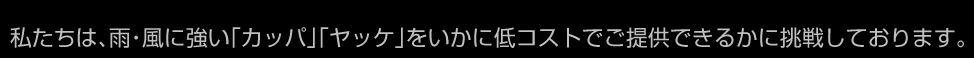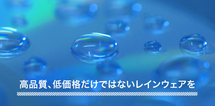 当社は、『カッパ』『ヤッケ』に特化した製造メーカーです。『カッパ』『ヤッケ』の基本的な機能である雨・風に強い商品を基本とし、さらに快適な屋外での活動のお手伝いができる商品作りをおこなっております。